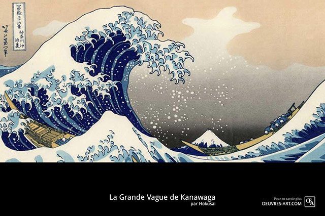 Cette gravure sur bois est l'un des ouvrages les plus reconnus de l'art japonais dans le monde. Elle représente une énorme vague qui menace des bateaux près de la préfecture japonaise de Kanagawa. Bien que parfois considérée comme un tsunami, la vague est, comme le mentionne le titre de l'image, plus susceptible d'être un grand okinami (littéralement « vague de la Haute Mer »). Comme dans toutes les estampes de la série, elle représente la région autour du mont Fuji dans des conditions particulières et la montagne elle-même apparaît dans le fond.