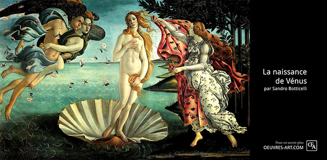 Botticelli a choisi le thème particulier de la création de Vénus comme un hommage aux travaux d’Homère. Dans la mythologie, Vénus a voyagé jusqu’à Cythère à dos de coquillage peu après sa naissance. Zéphyr, dieu du vent, aide Vénus dans son voyage en la poussant vers l’île. Dans ses bras se tient Aura et ils sont entourés de fleurs roses qui flottent (ou tombent) dans l’air autour d’eux. Un personnage divin, probablement Pomone, porte une robe blanche à motifs naturels, se tient debout sur la terre, attendant l’arrivée de Vénus et tenant une grande draperie qui flotte dans le vent. L’océan semble étrangement limité et calme comparé aux personnages de la peinture, avec des toutes petites vagues qui se jettent légèrement sur le rivage. Les seuls autres éléments vivants du tableau sont les roseaux près de la rive et les arbres bizarrement droits derrière Pomone.