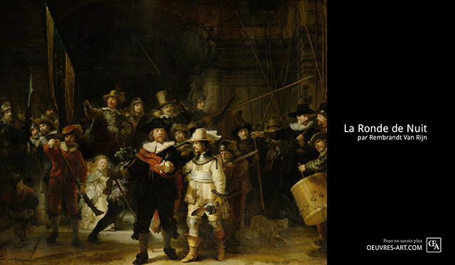 Il s’agit d’un portrait militaire peint en 1642 et commandé par le capitaine Banning Cocq pour être suspendu dans la Maison des Arquebusiers récemment construite à Amsterdam, ou peut-être pour honorer la visite de la reine française en exil Marie de Médicis.